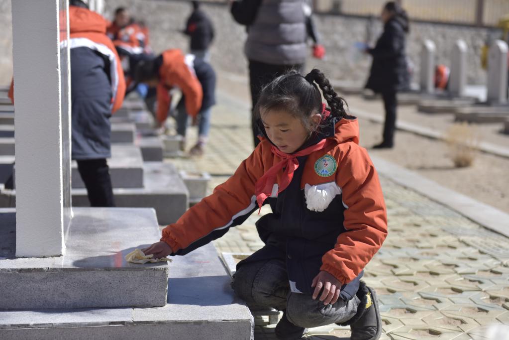 小學生細心擦拭著烈士的墓碑。(2021年4月4日 新華社記者翟永冠 攝)