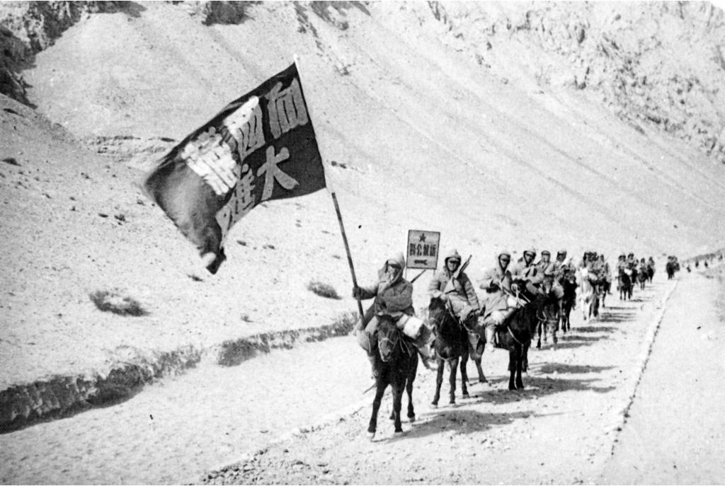 進藏先遣連高舉紅旗向西藏阿里進軍(執(zhí)旗者為先遣連副連長彭青云)。進藏先遣連紀念館提供