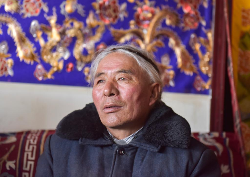65歲的扎布村藏族老人扎日向記者講述先遣連的往事。(2021年3月30日 新華社記者 格桑朗杰 攝)