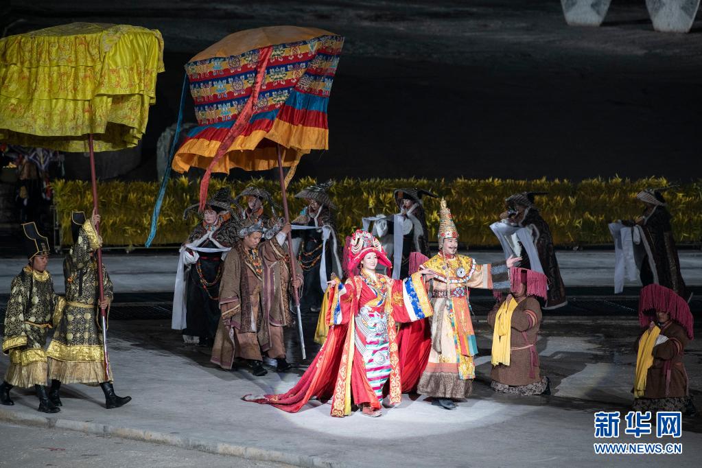 4月10日,演員在大型實(shí)景劇《文成公主》中演繹文成公主與松贊干布舉行婚禮的場(chǎng)景。新華社 孫瑞博 攝