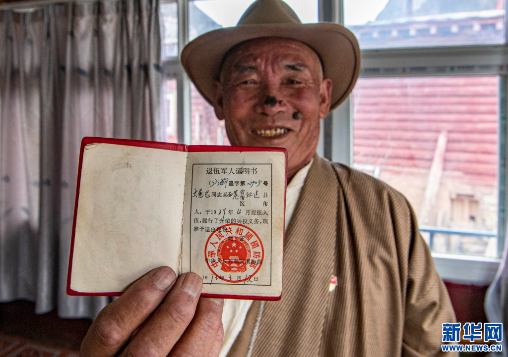 在位于昌都市江達(dá)縣崗?fù)墟?zhèn)崗?fù)写宓募抑?,普巴向記者展示自己的退伍軍人證明書(3月22日攝)。新華社記者孫非 攝
