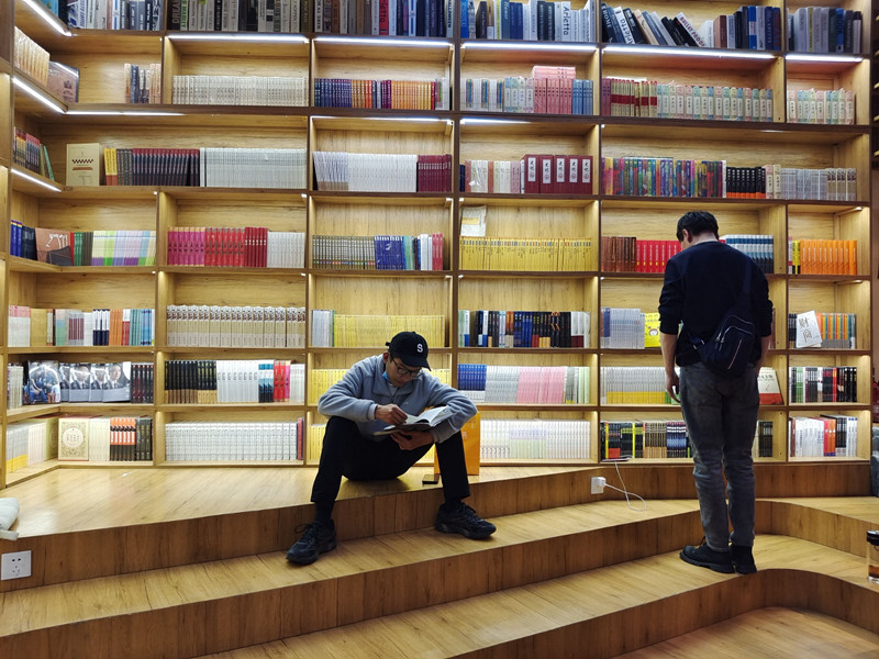 傍晚7點(diǎn),在萬(wàn)達(dá)廣場(chǎng)的“央喜書(shū)吧”里,與朋友約好吃飯的市民拉姆趁著朋友還沒(méi)到,抽空選購(gòu)著書(shū)籍;