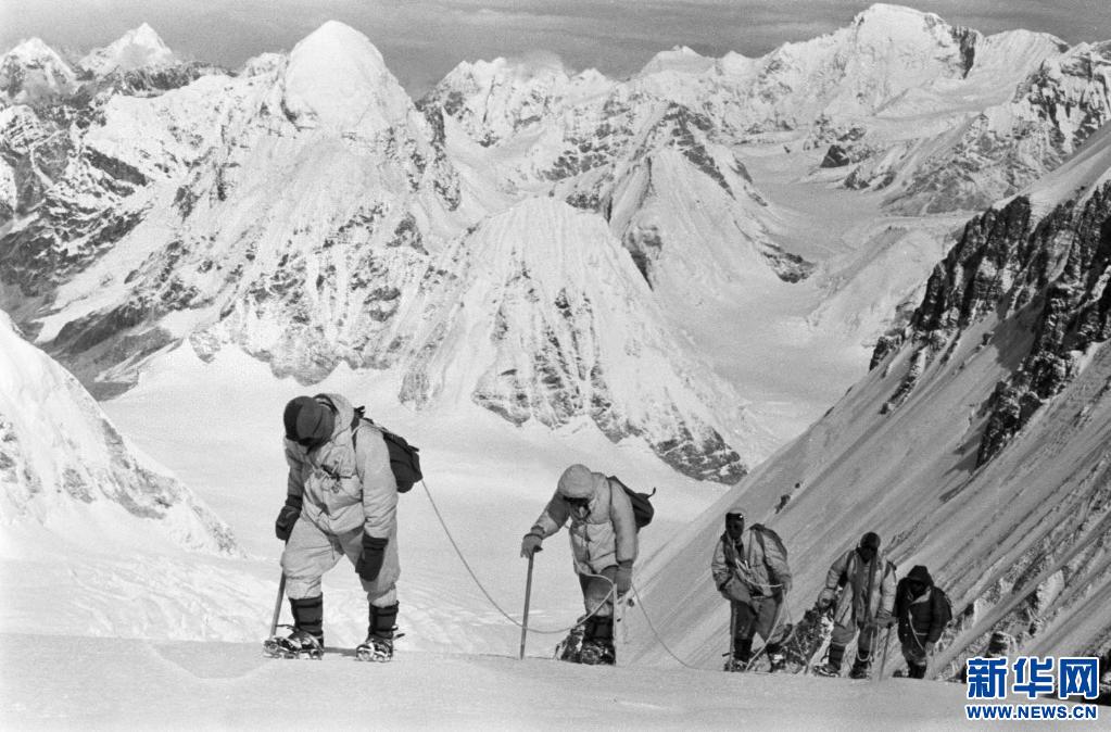照片拍攝于1960年5月,中國登山隊隊員在海拔7150米的冰雪坡上行進。新華社發(fā)