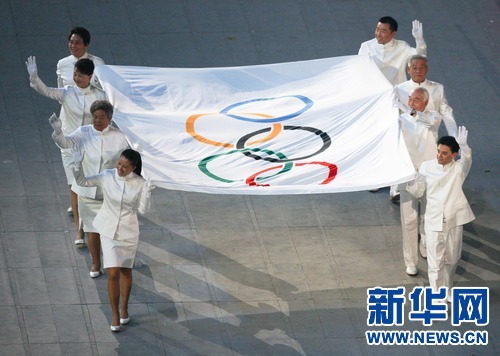 2008年8月8日,中國首位珠峰北坡登頂的女登山家潘多(左邊從前數第二位)在北京奧運會開幕式上,手執(zhí)奧林匹克會旗入場。新華社發(fā)