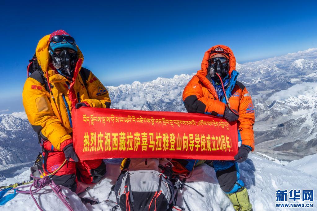 2019年5月24日,西藏拉薩喜馬拉雅登山向導學校的向導們在珠峰頂上慶祝學校成立20周年。新華社發(fā)(扎西次仁攝)