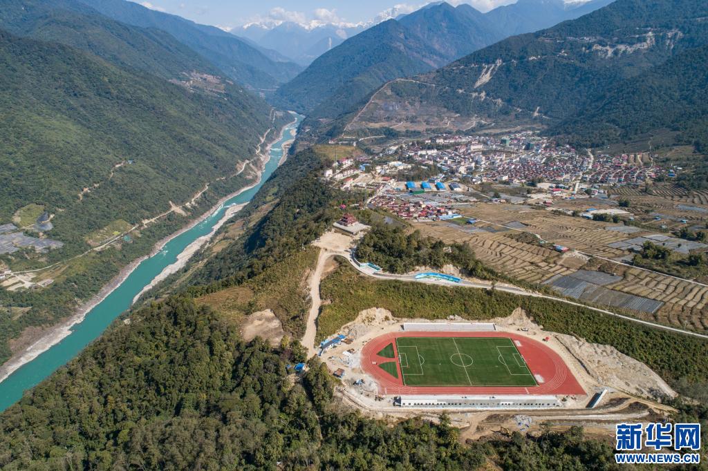 墨脫縣新建的11人制足球場位于雅魯藏布江邊(無人機照片)。新華社記者孫非攝