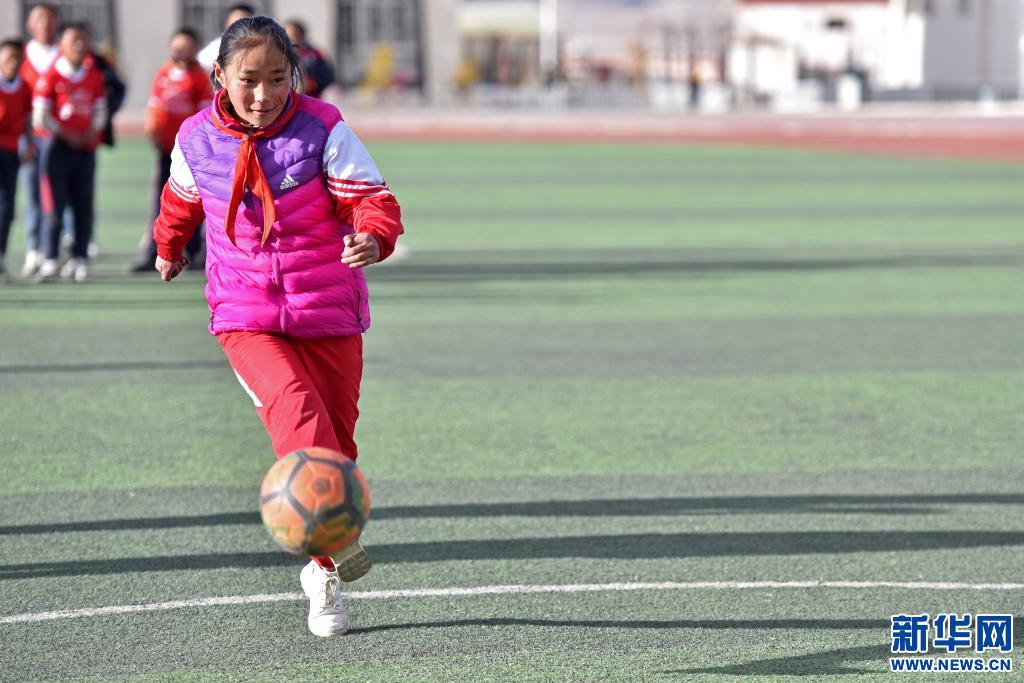 藏族姑娘多吉卓瑪在當雄縣龍仁鄉(xiāng)小學參加學校的足球興趣課。新華社記者孫瑞博攝