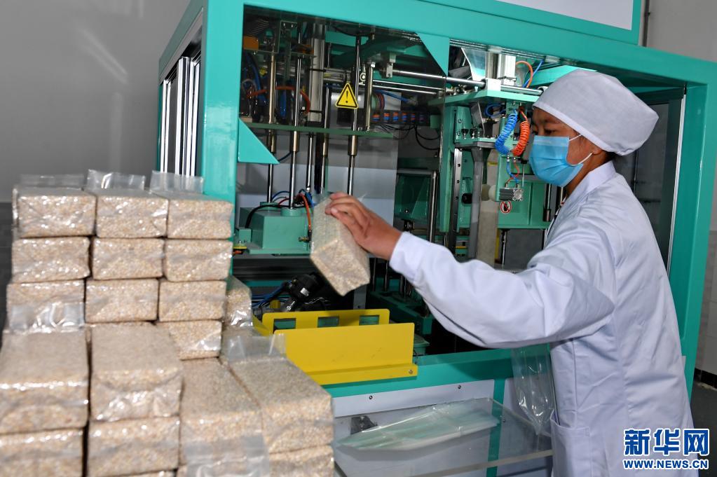 青稞加工廠的工人正在將青稞米裝袋(2017年4月27日攝)。新華社記者 張汝鋒 攝