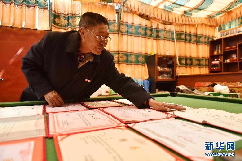 在西藏仲巴縣,邊瓊整理自己的榮譽(yù)證書(5月16日攝)。新華社記者 孫瑞博 攝