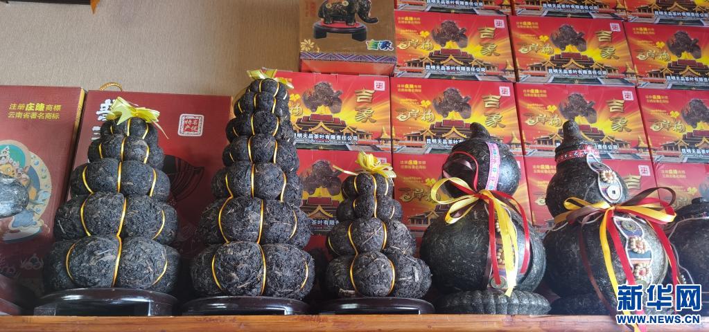 在位于西藏拉薩的一家茶葉公司的門店內(nèi)擺放著造型獨特的茶葉制品(4月23日攝)。新華社記者 張京品 攝