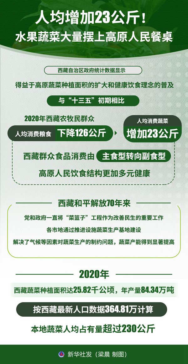西藏自治區(qū)政府統(tǒng)計數(shù)據(jù)顯示,得益于高原蔬菜種植面積的擴大和健康飲食理念的普及,與“十三五”初期相比,2020年西藏農(nóng)牧民群眾人均消費糧食下降126公斤,人均消費蔬菜增加23公斤,西藏群眾食品消費由主食型轉(zhuǎn)向副食型,高原人民飲食結(jié)構(gòu)更加多元健康。