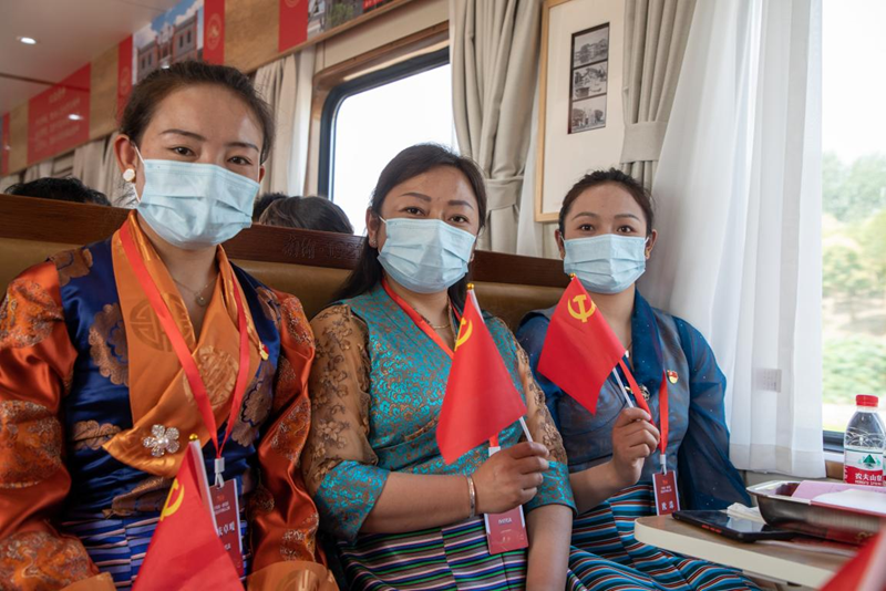 “五星紅旗迎風飄揚,勝利歌聲多么響亮!歌唱我們親愛的祖國,從今走向繁榮富強……“代表團成員才旺金美引領大家唱起《歌唱祖國》,雄厚嘹亮的歌聲飄蕩在車廂里。專列上,每個車廂、每個團隊都有自己的主題活動,那曲市色尼區(qū)代表團以講一段故事、學一節(jié)黨史、唱一首紅歌追溯紅色記憶,重溫黨的光輝歷程。