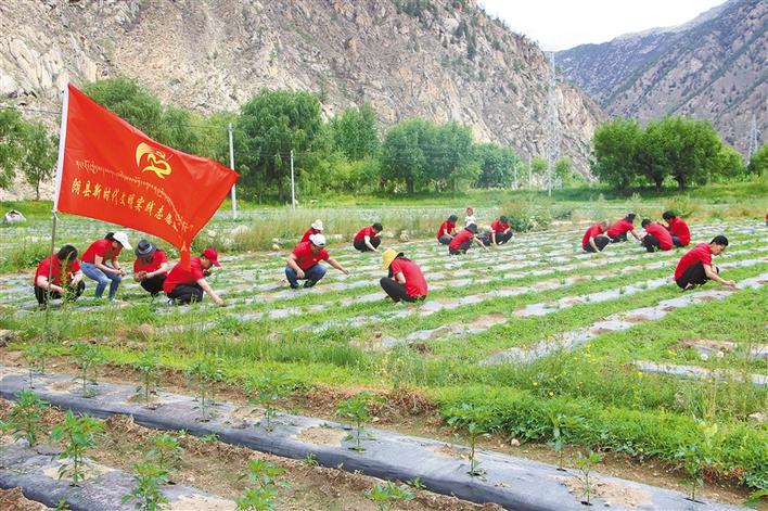 圖為西藏自治區(qū)林芝市朗縣新時代文明實踐志愿服務(wù)隊來到洞嘎鎮(zhèn)達(dá)木村,幫助當(dāng)?shù)卮迕窀赊r(nóng)活。