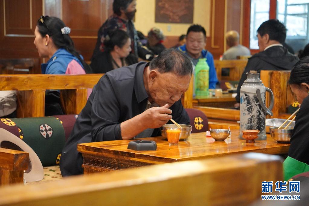 在位于拉薩市中心八廓街里的桑曲茶館,客人在吃藏面(6月29日攝)。新華社記者 王澤昊 攝