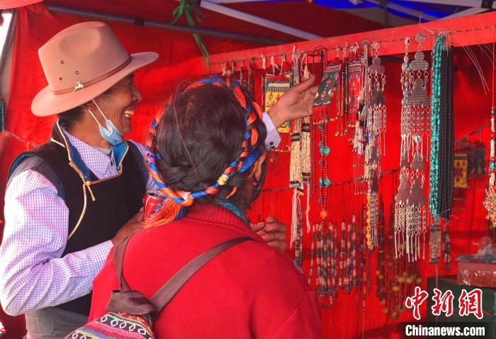 圖為一對藏族夫婦在打隆物交會上選購飾品。冉文娟 攝