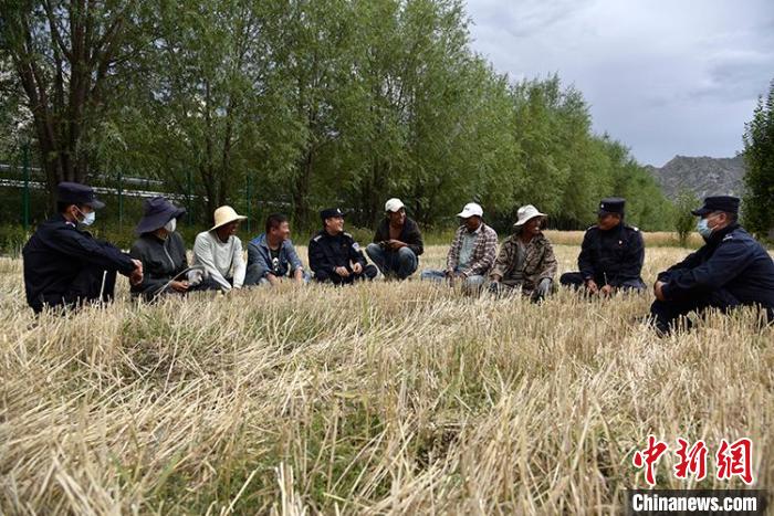 一陣忙碌過后,大家圍攏在田里聊變化說發(fā)展。慶祝西藏和平解放70周年大會剛剛舉行,大家聊著現場觀禮、收聽收看的感受。參加現場大會的民警高揚向大家分享現場感受,講述自己在西藏生活學習工作22年的發(fā)展變化和入警初心。歡聲笑語過后,大家又忙碌起來。田間地頭藏青藍的身影,與金黃麥地構成一幅加強民族團結、警民魚水情深的動人畫卷。