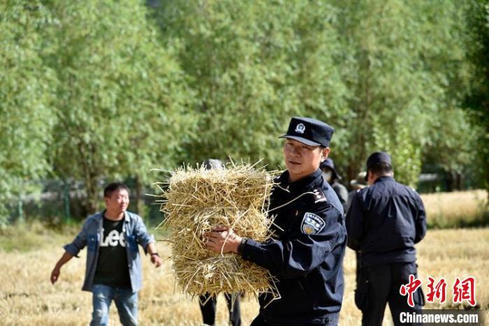 金黃的麥穗,在微風下吹拂。來到邊巴次仁家的田地,民警們與駐村工作隊隊員三三兩兩忙碌起來,幾個人拿起鐮刀趕著在收割機到來前收割倒地的麥子,另外兩個人又忙著將打包好的麥稈裝車。經過一個多小時的勞作,大家齊心協(xié)力幫著將脫谷麥粒裝進農用車里。