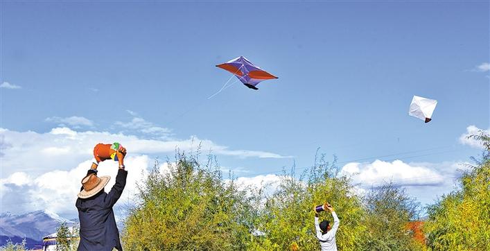 每年金秋時(shí)節(jié),在拉薩城的上空,便會(huì)出現(xiàn)千百只風(fēng)箏漫天飛舞、爭(zhēng)奇斗艷的景觀(guān)。在碧藍(lán)的天空下,那些形狀各異、如鷹似燕的風(fēng)箏,時(shí)而高飛、時(shí)而低落、時(shí)而旋轉(zhuǎn)、時(shí)而打斗,一旁觀(guān)戰(zhàn)或正在放風(fēng)箏的人仰頭觀(guān)看,歡呼聲、嘆息聲、助威聲此起彼伏,很是熱鬧。