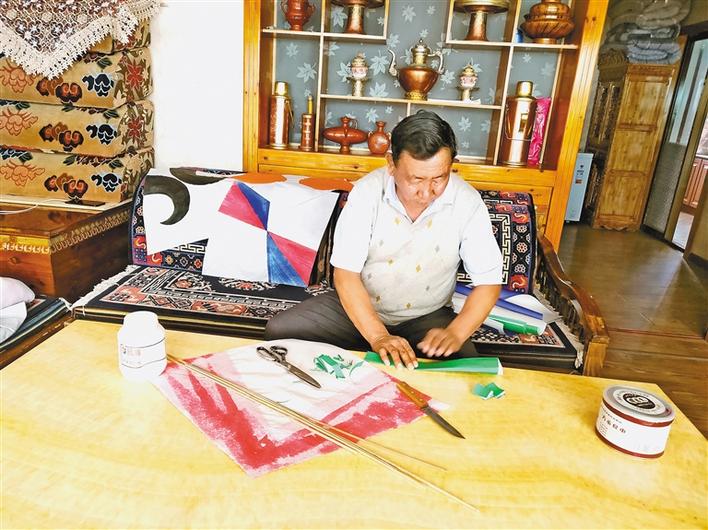 圖為拉薩風(fēng)箏制作技藝自治區(qū)級(jí)代表性傳承人普窮在家制作風(fēng)箏。