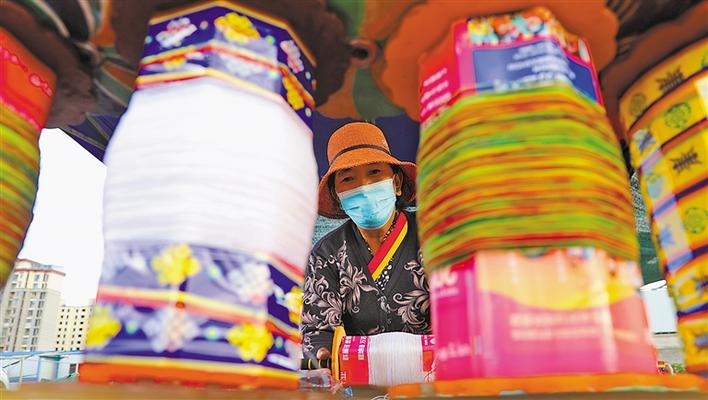 在拉薩河谷售賣(mài)風(fēng)箏的攤位中,拉薩風(fēng)箏制作技藝自治區(qū)級(jí)代表性傳承人普窮的生意最紅火,經(jīng)常有客人一買(mǎi)就是幾十只風(fēng)箏。