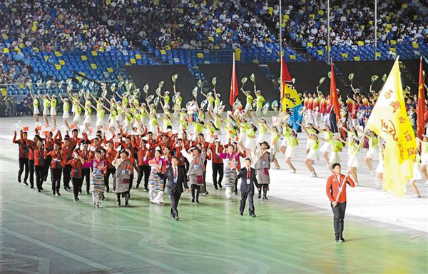 9月15日晚,西藏自治區(qū)體育代表團(tuán)在入場(chǎng)儀式上。潘多 王莉 攝