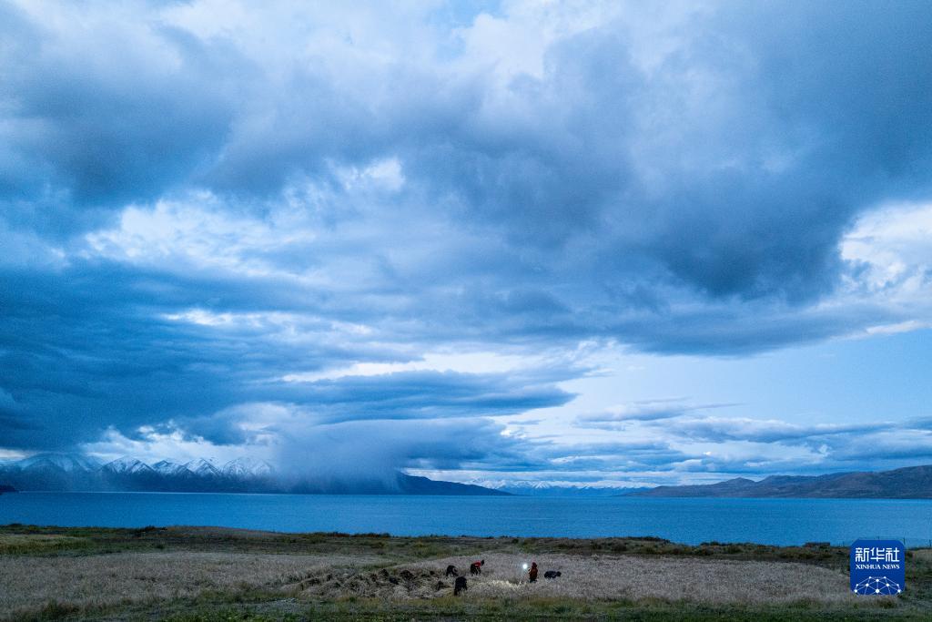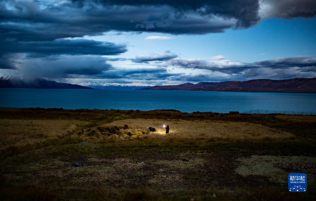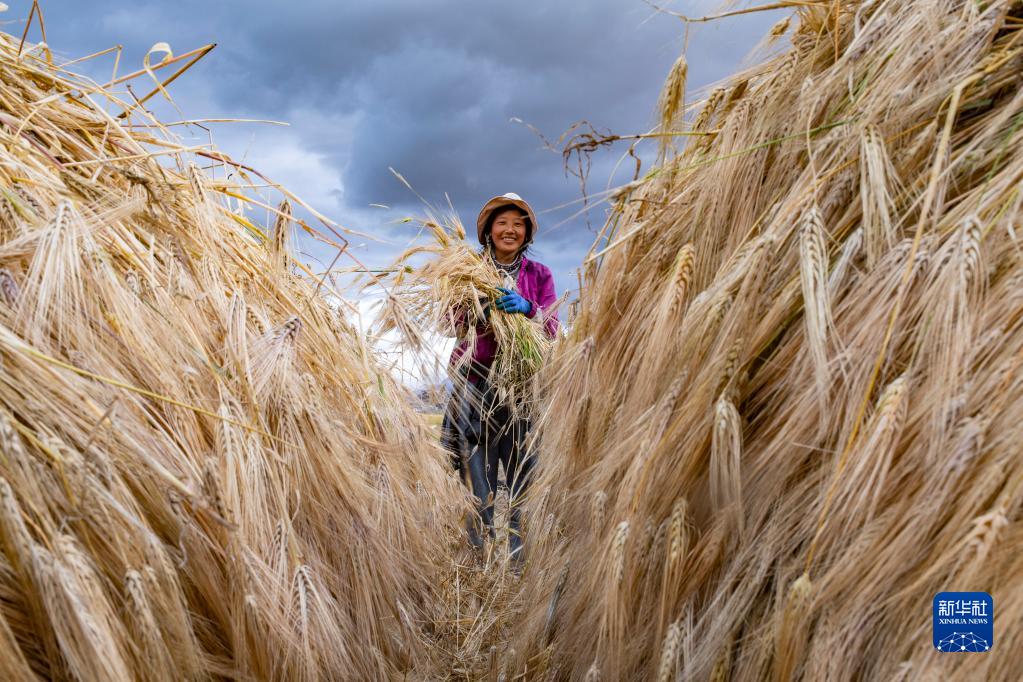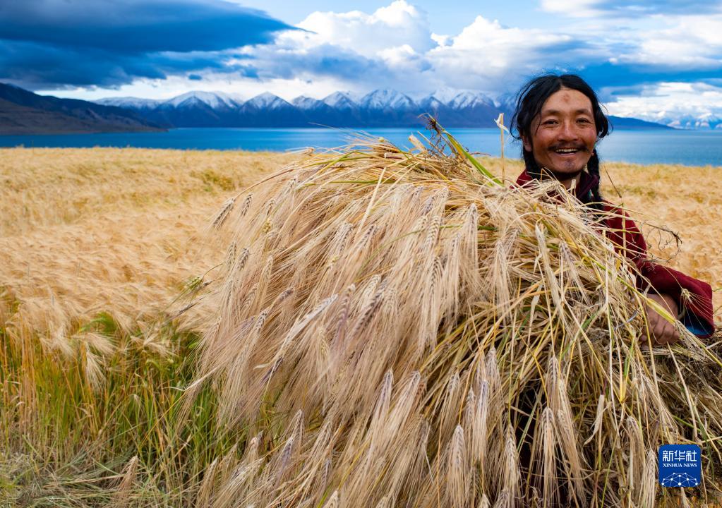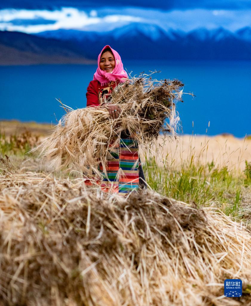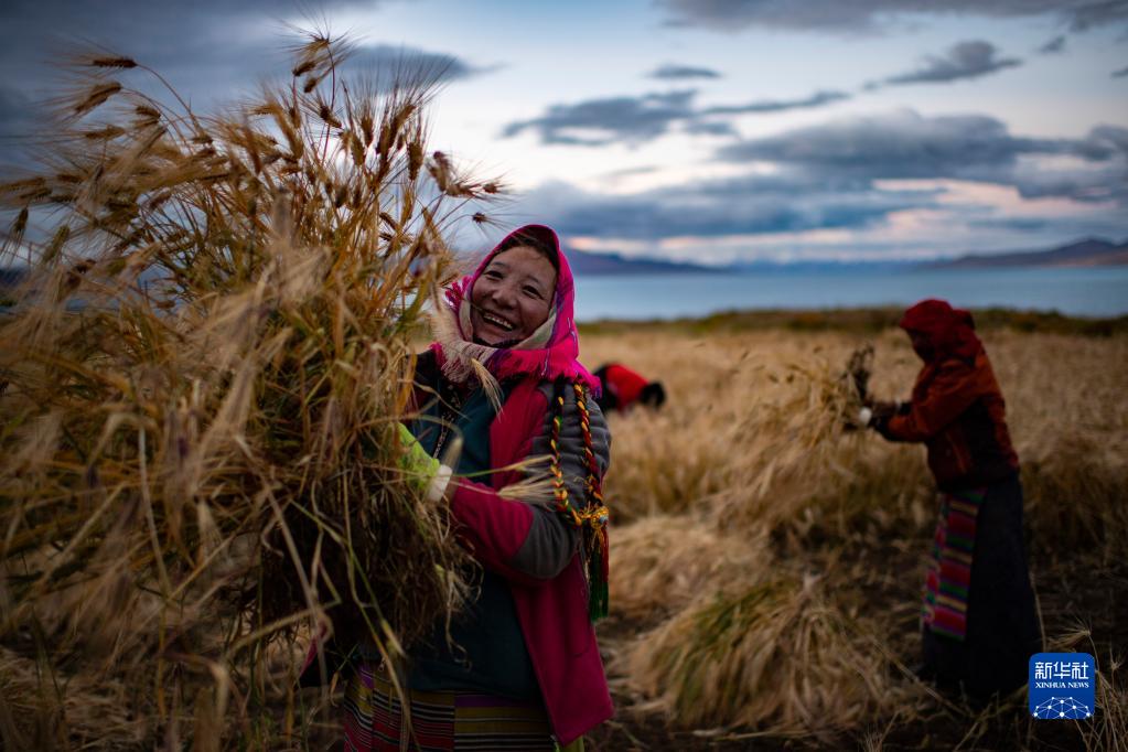 當(dāng)日,西藏那曲市尼瑪縣文部鄉(xiāng)文部南村村民開鐮收割農(nóng)田里的青稞。文部鄉(xiāng)文部南村位于當(dāng)惹雍措湖畔,海拔4645米,這里的村民以“薩馬卓”(半農(nóng)半牧之意)為主,在藏北高原獨具特色。