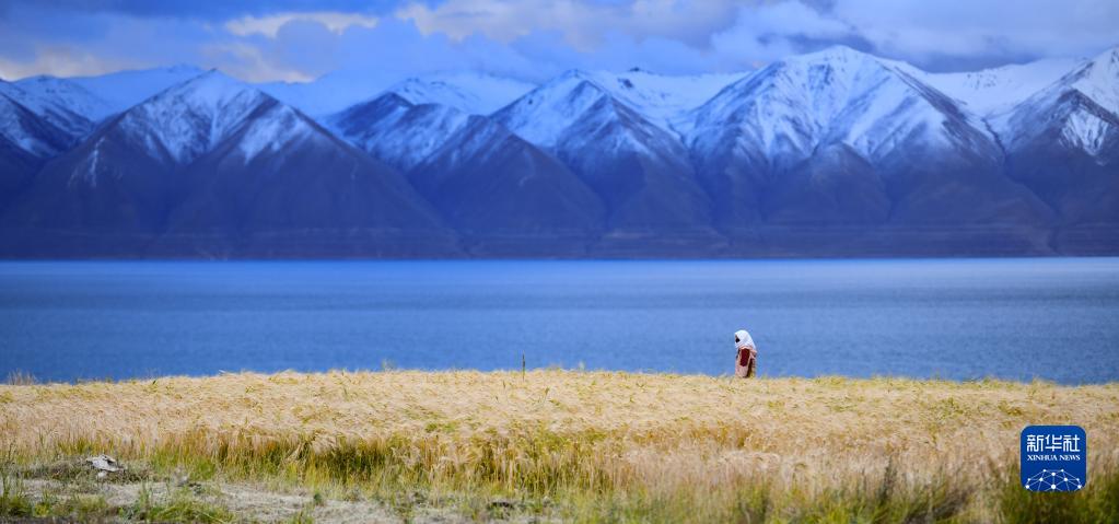 9月23日在西藏那曲市尼瑪縣文部鄉(xiāng)文部南村拍攝的金色的青稞和雪山湖泊。新華社記者 晉美多吉 攝