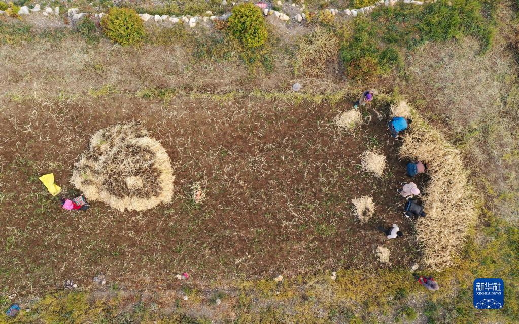 9月23日清晨,西藏那曲市尼瑪縣文部鄉(xiāng)文部南村村民開鐮收割(無人機照片)。新華社記者 晉美多吉 攝