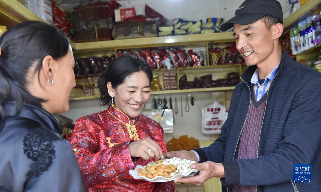 阿卜杜杰力力·麥提如剛(右)于2010年從新疆和田墨玉縣來到西藏阿里獅泉河鎮(zhèn)做干果生意,并融入到獅泉河鎮(zhèn)藏布居委會的民族大家庭中。圖為阿卜杜杰力力·麥提如剛請當?shù)夭刈迮笥哑穱L來自家鄉(xiāng)的特產(chǎn)(9月22日攝)。新華社發(fā)(索朗羅布 攝)