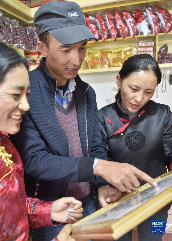 從新疆和田墨玉縣來到西藏阿里獅泉河鎮(zhèn)的阿卜杜杰力力·麥提如剛(中)給鄰居們看自己的家庭合影(9月22日攝)。新華社發(fā)(索朗羅布 攝)