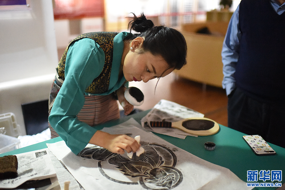 9月29日,在西藏大學新校區(qū)圖書館,日喀則石刻藝術博物館專業(yè)傳拓員德吉白珍演示拓片制作過程。新華網(wǎng) 旦增努布 攝