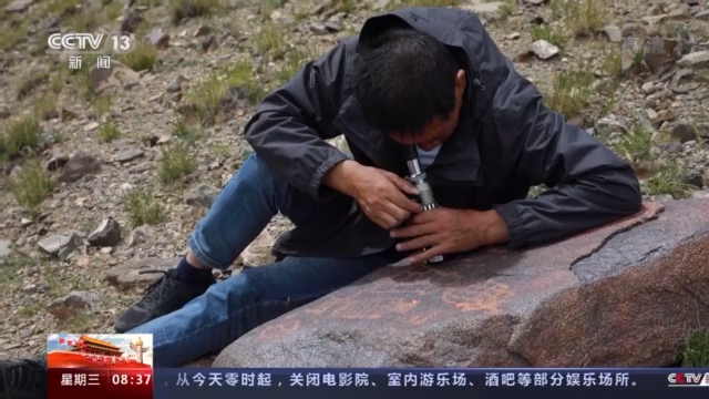 總臺記者 陳琴:現(xiàn)在我們是跟隨科考隊員來到了海拔4700米的加林山巖畫這么一個分布區(qū)域,這里的位置就是在尼瑪縣榮瑪鄉(xiāng)依布茶卡鹽湖的旁邊,我們看見科考隊員正在對這幅巖畫進(jìn)行登記和記錄。