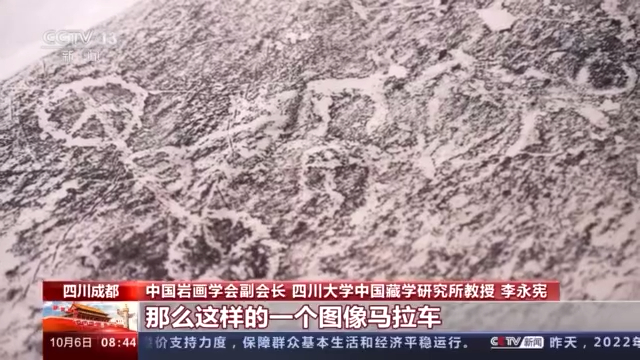 中國巖畫學(xué)會副會長、四川大學(xué)中國藏學(xué)研究所教授 李永憲:那么這樣的一個圖像馬拉車,騎馬的人、牦牛、三只鹿、公鹿,所有的動物、人物、車輛,它們都是朝一個方向行進(jìn)。