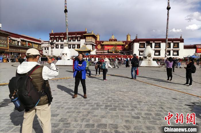 圖為大昭寺廣場(chǎng),游客拍照留念?!〗w波 攝