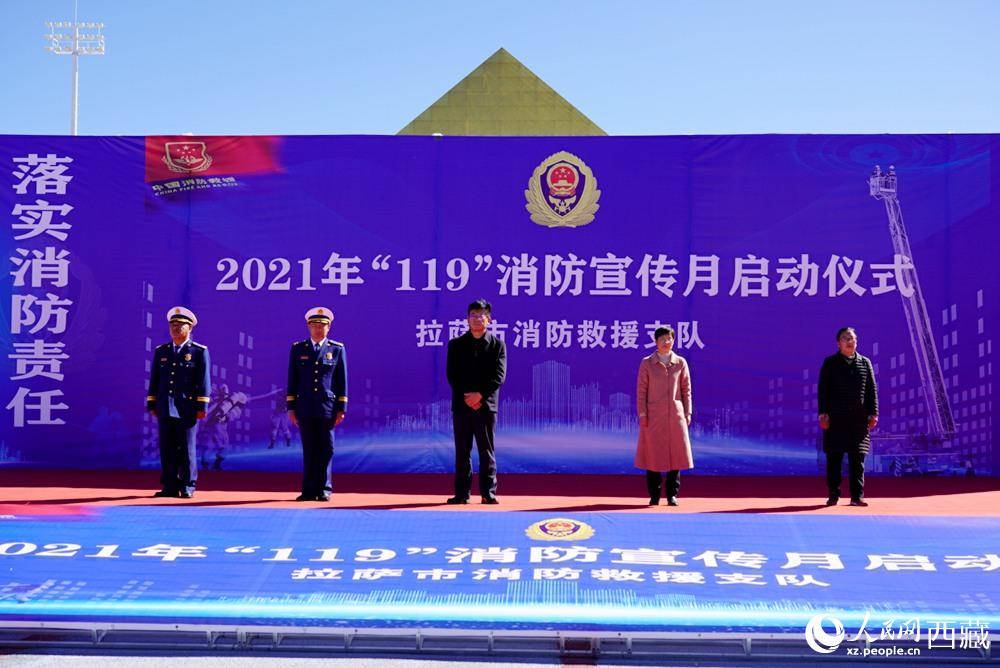 拉薩市2021年“119”消防宣傳月啟動儀式現(xiàn)場。拉薩市委常委 、常務(wù)副市長占堆(左三)出席儀式并講話。人民網(wǎng) 次仁羅布攝