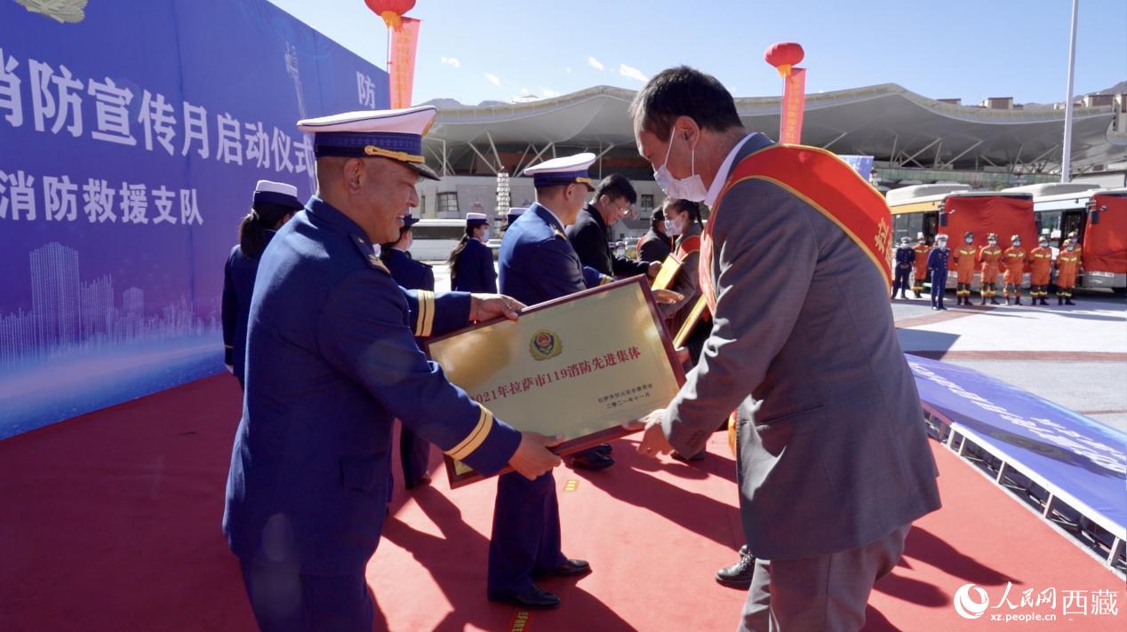 啟動儀式上,表彰了2021年度拉薩市“119”消防先進集體、先進個人。與會領(lǐng)導(dǎo)為受表彰的單位及個人代表頒發(fā)證書。