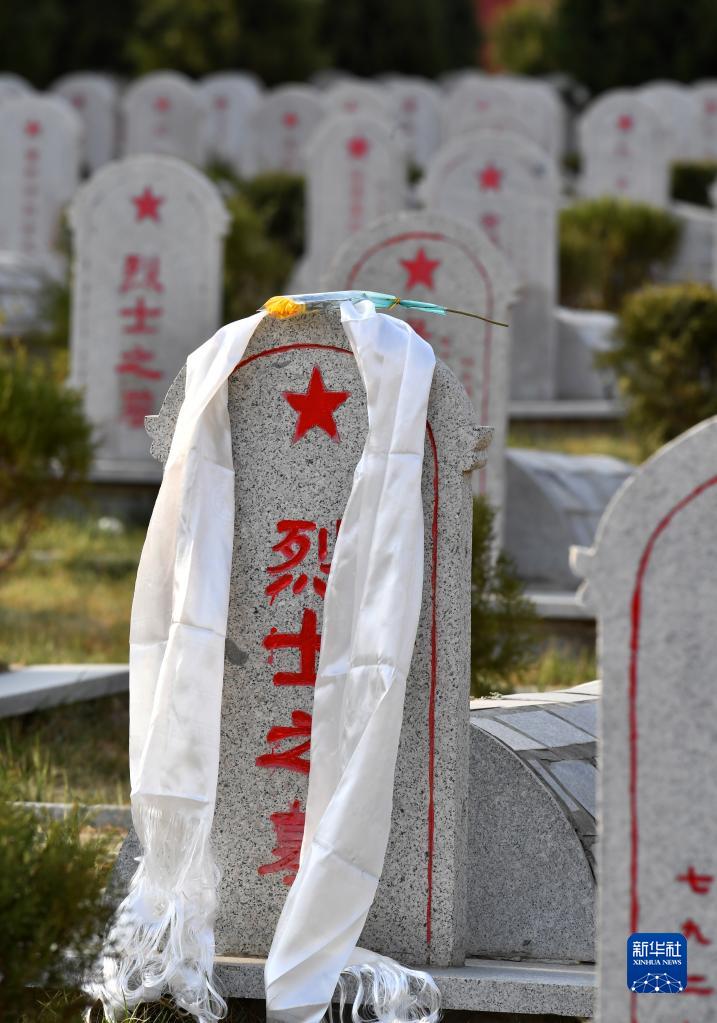 在西藏拉薩烈士陵園,一條潔白的哈達(dá)掛在烈士墓碑上(4月4日攝)。新華社記者 覺果 攝