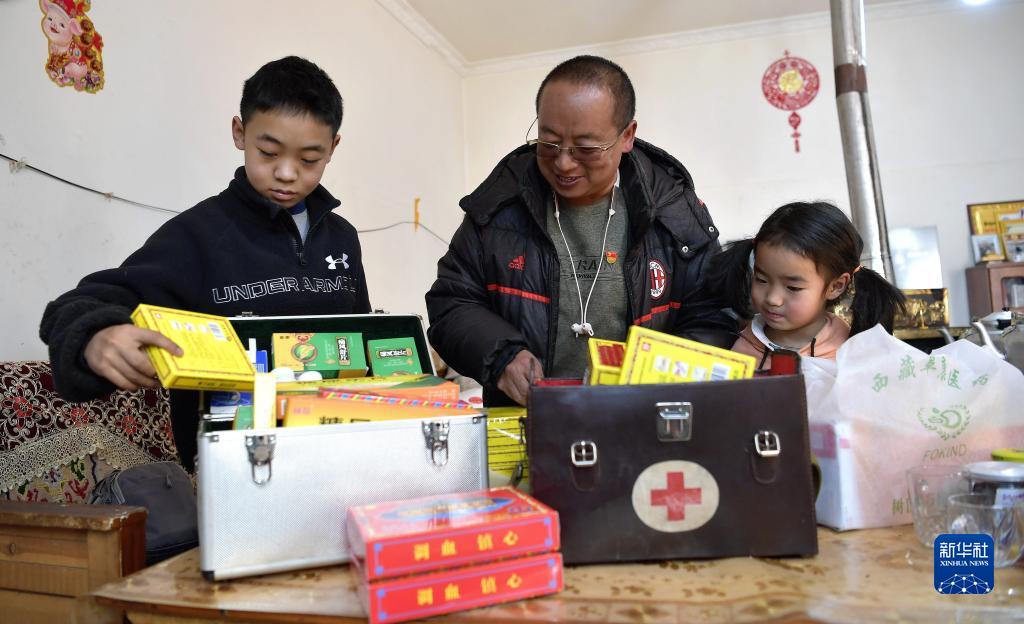 秋加(中)和他的孩子在整理藥箱(1月14日攝)。新華社記者 張汝鋒 攝