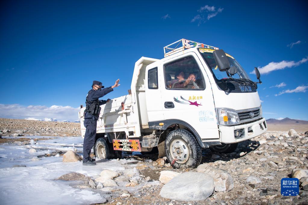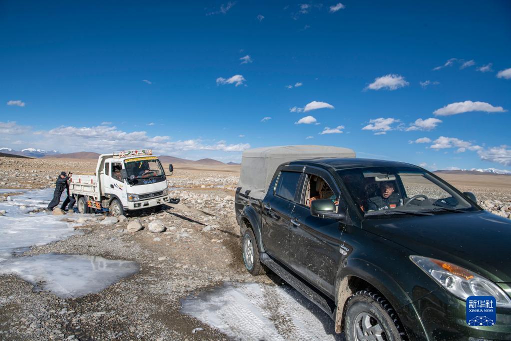 普瑪江塘邊境派出所的移民管理警察在巡邏途中協(xié)助牧民旦增多杰一家拖拽“罷工”的小貨車(11月20日攝)。新華社記者 孫非 攝