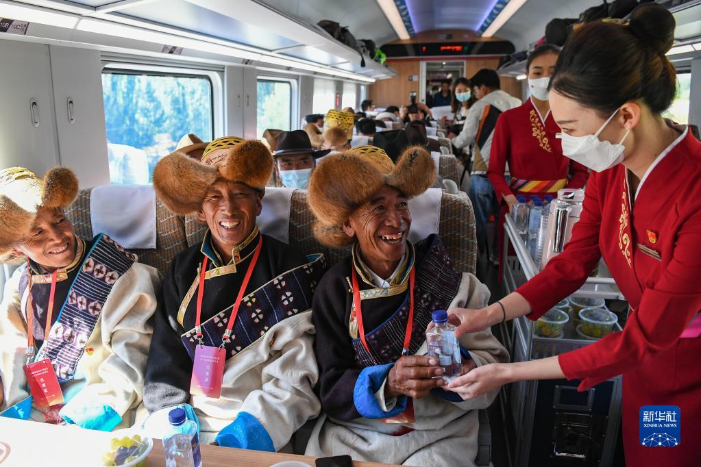 2021年6月25日,全長(zhǎng)435公里、設(shè)計(jì)時(shí)速160公里的拉林鐵路建成通車,西藏首條電氣化鐵路建成,同時(shí)復(fù)興號(hào)實(shí)現(xiàn)對(duì)31個(gè)省區(qū)市全覆蓋。這是6月25日列車員向乘坐首趟復(fù)興號(hào)高原內(nèi)電雙源動(dòng)車組的乘客遞水。新華社記者 普布扎西 攝