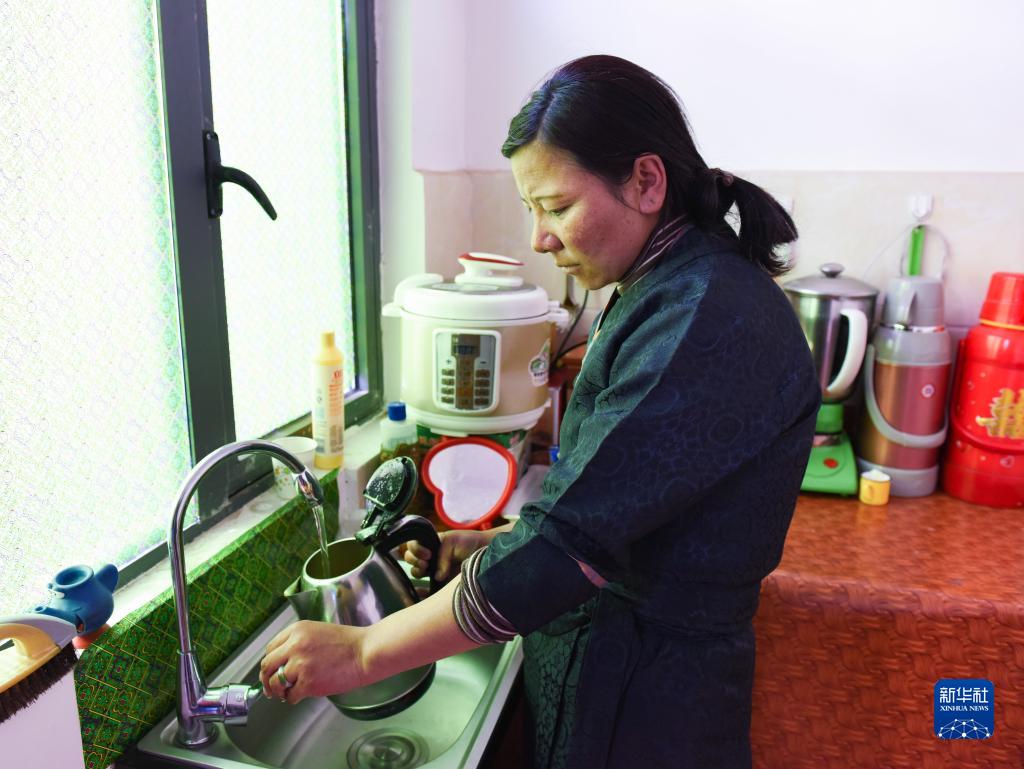 西藏山南市貢嘎縣森布日極高海拔生態(tài)搬遷安置點內,村民次仁卓嘎在家里用上了自來水。(2020年1月12日攝)。新華社記者 田金文 攝