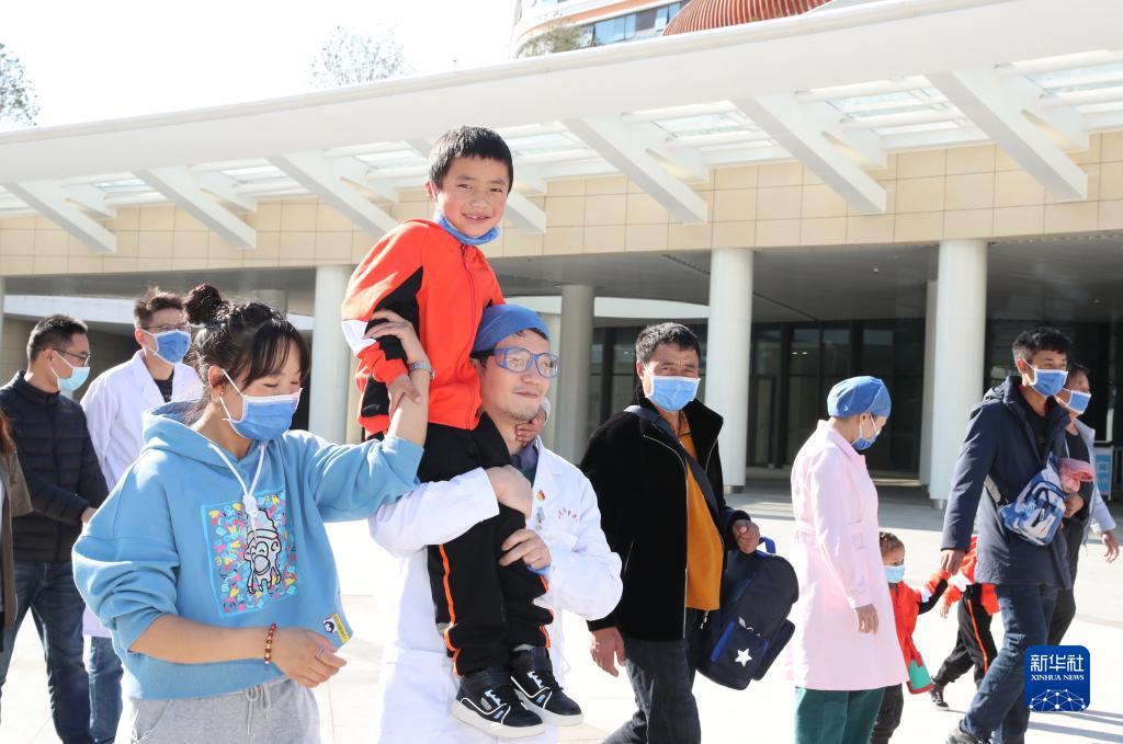 12月1日,康復(fù)出院的先心病患兒與家人在醫(yī)院工作人員的陪伴下走出福建省兒童醫(yī)院大樓。新華社記者 姜克紅 攝