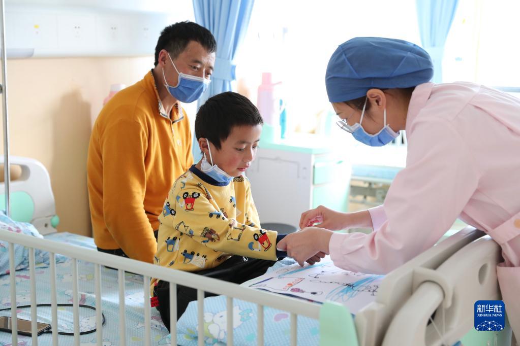 11月25日,在福建省兒童醫(yī)院病房,護士向康復(fù)中的先心病患兒索朗次珍表示鼓勵。新華社記者 姜克紅 攝