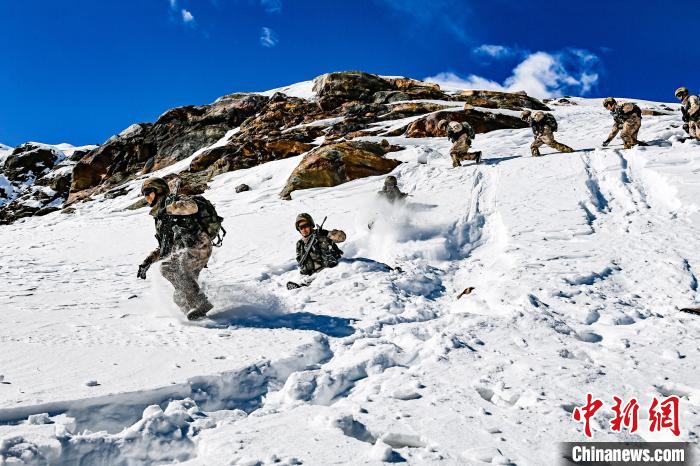 巡邏途中,官兵們順雪坡滑下,節(jié)省時間。 王江 攝