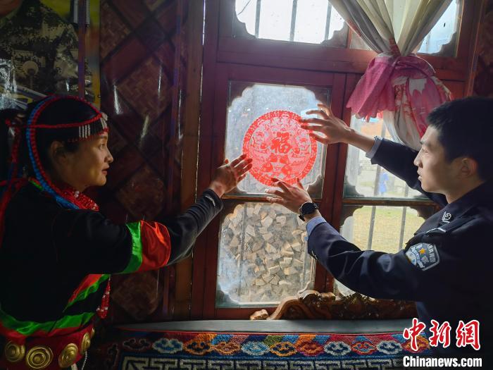 圖為林芝達木邊境派出所民警為轄區(qū)民眾貼窗花?!⊥鯘?攝