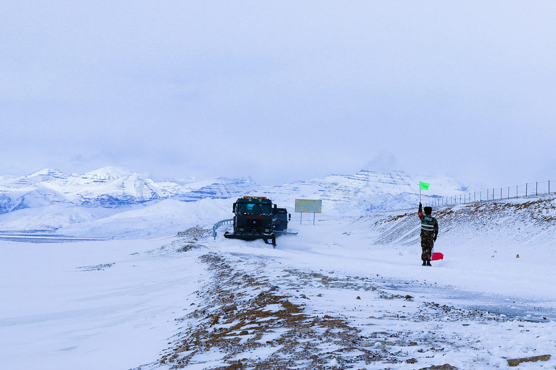 因?yàn)?zāi)害現(xiàn)場(chǎng)地處平均海拔4000多米以上海拔,持續(xù)降雪不斷,加之氣溫低至零下20多攝氏度,給整個(gè)道路搶通工作帶來了不少難度。為盡快清理路面積雪搶通道路,武警官兵采取“人歇機(jī)不停、分段搶通、先通后拓”的方法進(jìn)行全力搶通,克服了高寒缺氧及紫外線強(qiáng)烈等重重困難。