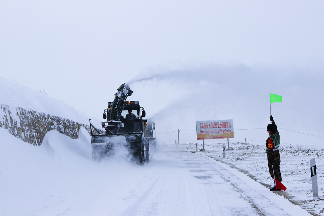 圖為武警官兵正在新藏線馬莜木拉段清理積雪。