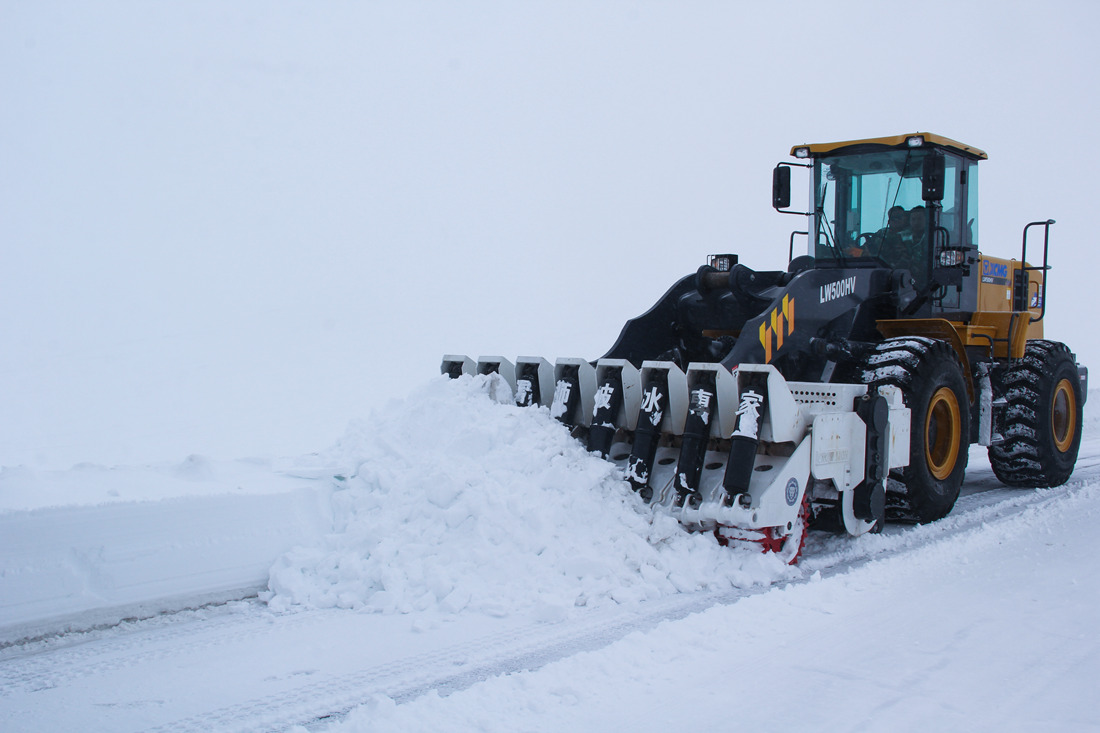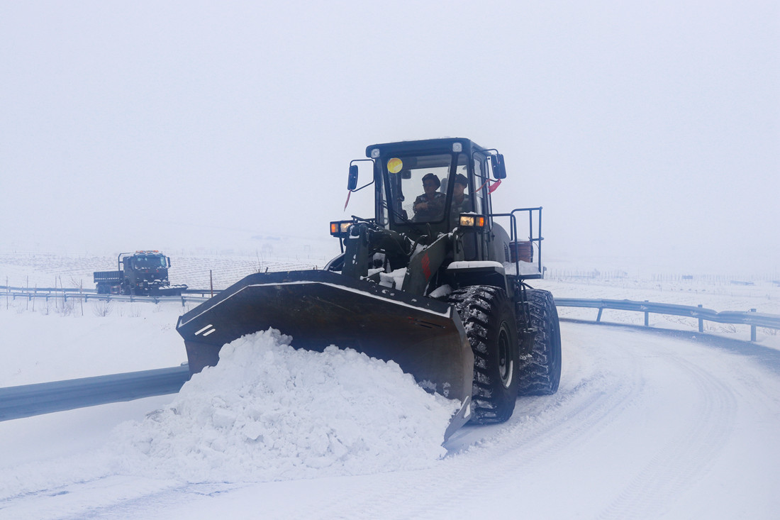圖為武警官兵利用裝載機(jī)清理道路積雪。