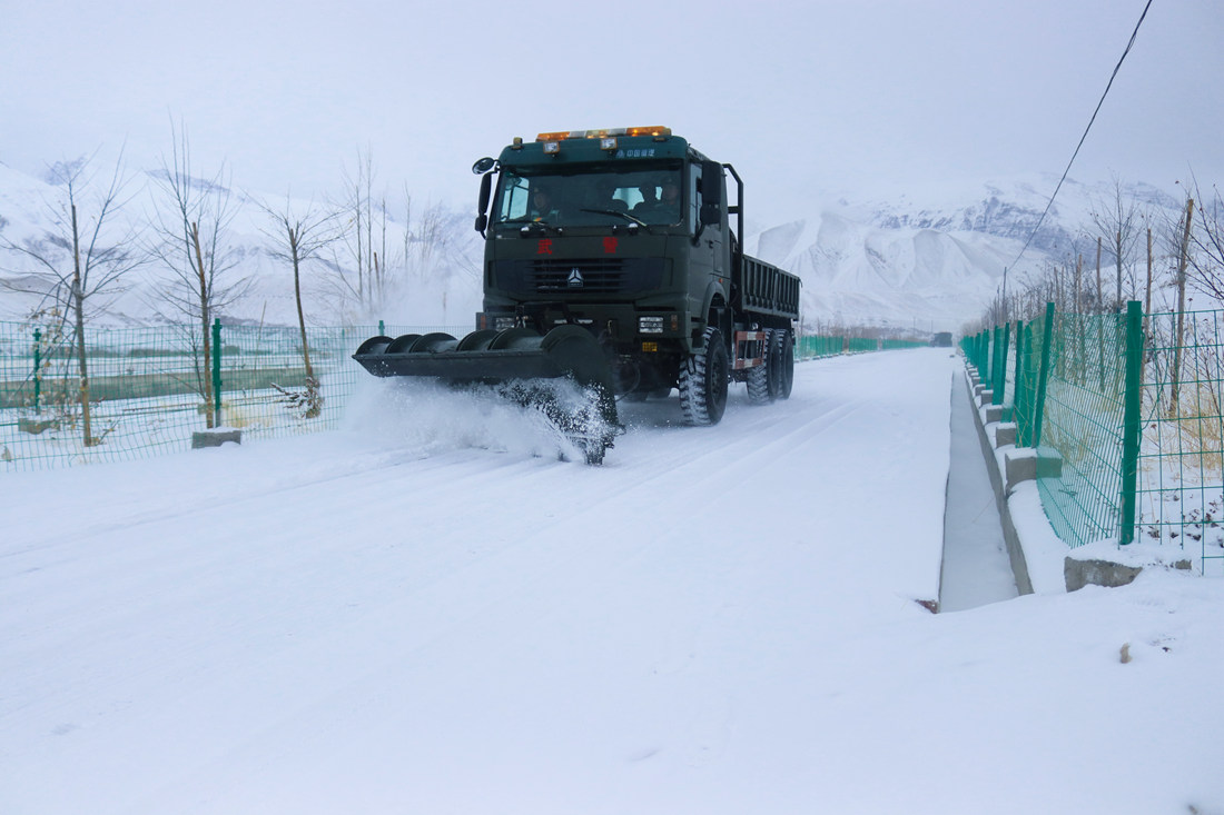 圖為武警官兵正在普蘭支線清理路面積雪。