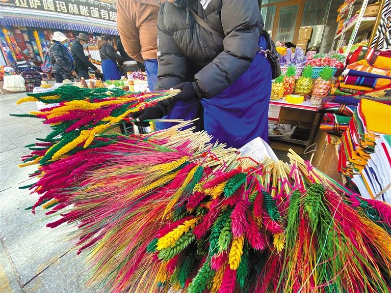 堆龍德慶區(qū)桑木社區(qū)五組,家家戶戶都會制作“羅薩美朵”并在藏歷新年前售賣?!啊_薩美朵’是一種經(jīng)過染色、手工制作、色彩各異的麥穗狀花朵,每年春季播種,金秋時節(jié)收獲,懸掛風干,完好保存。到了藏歷11月,采購染色的顏料和捆扎用的毛線繩,把早已收割晾曬好的‘羅薩美朵’拿出來,為其染色、捆扎,然后拿到市區(qū)進行銷售?!鄙D旧鐓^(qū)五組居民達珍告訴記者。